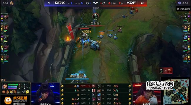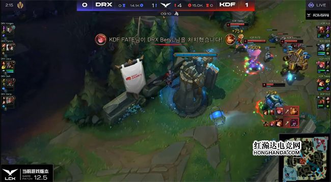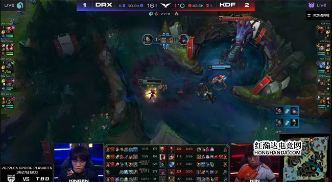 Ellim的盲僧稳稳控下土龙和峡谷先锋,佛耶戈见金克丝在下路爽吃镀层,想要和霞、洛前后包夹,不料盲僧就在金克丝身后反蹲,Teddy的金克丝净化秒解洛的魅惑,闪现拉开身位反打,十分冷静地等佛耶戈交了大招和闪现再以远程火箭将其带走,DRX下路一血塔随之告破。16分钟双方在峡谷先锋河道展开拉扯,DRX付出小法师传送加洛闪现的代价如愿拿到先锋,作为交换KDF击杀海克斯小龙。大龙出生后DRX推掉三路一塔,KDF没有拉开经济差。