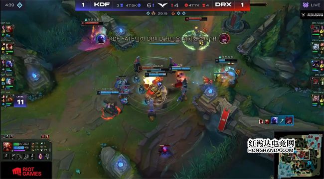 Kiin的酒桶拿到2个人头,令杰斯对线期无力打出优势,盲僧想要从下路打开局面时又被狗熊反蹲得手,泰坦换了霞完全不亏,KDF节奏全面起势,狗熊连续控下两条小龙,DRX只能偷掉峡谷先锋勉强止损。17分钟双方在小龙河道展开拉扯,KDF打出1换2后选择打小龙,卡牌传送绕后没有被发现,配合杰斯和霞从三方包夹,击杀了KDF双C接盘火龙,杰斯单吃了中路一血塔,霞也单吃了下路一塔,DRX不但稳住了节奏,而且经济也反超了3千。