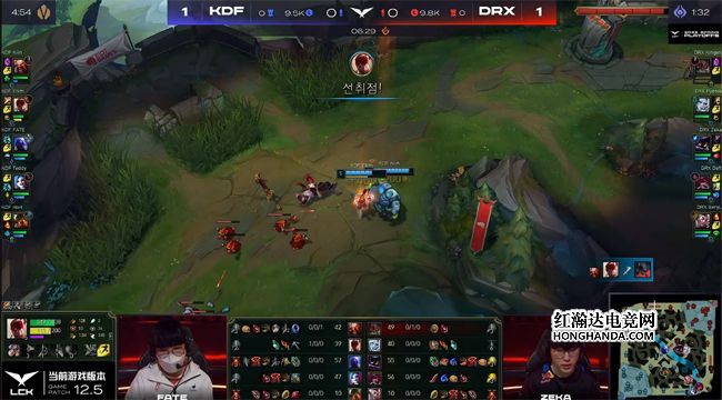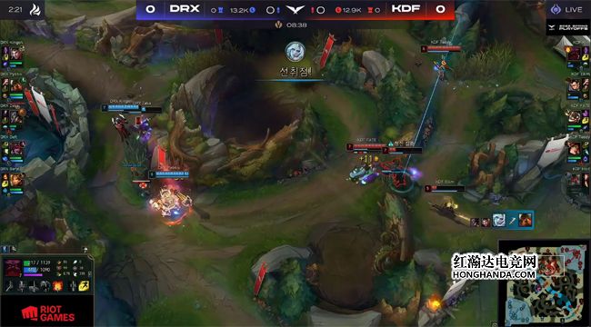 由于双方阵容大体不变,所以前期三线仍然和平发育,DRX在8分钟直接整了一波“大活儿”:DRX野辅在峡谷先锋河道抓住了落单的狗熊,拿到一血后卡牌不慎在中路被KDF中辅黏住,没有交出闪现就被佐伊的飞星带走,DRX为了掩护卡牌阵型分散,KDF打出一波1换5,团灭DRX梦幻起飞!