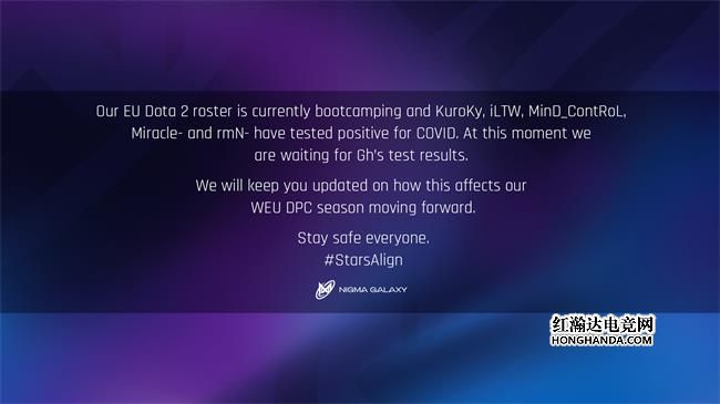 昨晚NIGMA在官方推特上宣布一个坏消息,队内出了GH暂时未出结果外全员新冠呈阳性。由于新冠缘故NIGMA的比赛将被推迟。