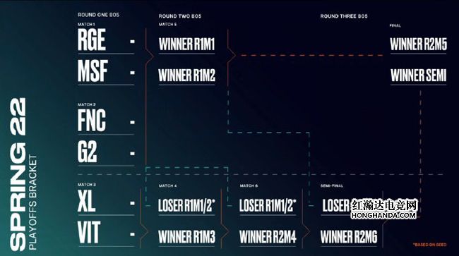 LEC春季赛季后赛将于北京时间3月26日凌晨2点开战,胜者组第一轮分别是RGE vs MSF和FNC vs G2,败者组第一轮则是XL vs VIT,决胜预计在北京时间4月11日凌晨1点进行。不知在雄狮MAD陨落之后,RGE能否打破“BO5魔咒”成功加冕,还是FNC、G2当中的一队重现往日辉煌,抑或是Perkz率领VIT书写“黑六传奇”,让我们拭目以待吧!