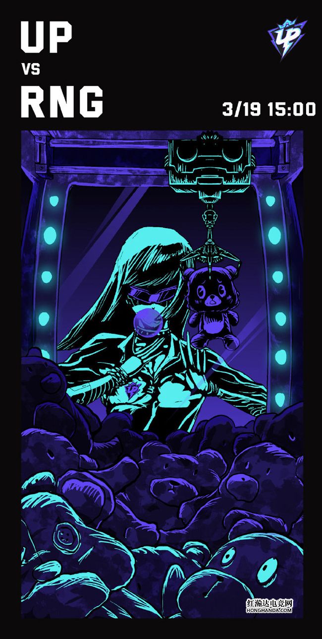 UP的海报标题为“抓 单”,代表UP的“机械姬”从娃娃机中抓起了落单的RNG软泥熊玩偶。无缘季后赛的UP可以毫无压力地放开手脚迎战RNG,这场比赛的最大看点自然是Cryin直面去年的老东家!