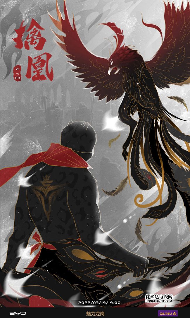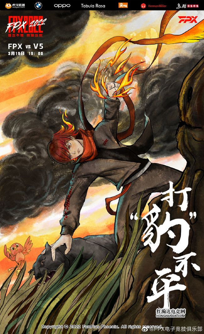 FPX的海报标题是“打‘豹’不平”,小凤凰少年压制住了象征V5的黑豹,使出“烈焰拳法”准备痛击对手。虽然FPX近期收获3连胜状态有所回暖,但积分只有7-7,剩下2场比赛必须全胜才能晋级季后赛,因此今晚也是小凤凰的“生死战”。