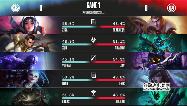 人马前期在上路花费了很大经历埋伏刀妹但没能得手,反而刀妹到六以后找到机会上前强杀杰斯,人马虽然立刻赶到但杰斯还是被刀妹收下一血,人马含泪收下刀妹人头。接下来iG中野围绕上半区展开疯狂军训,杰斯短短几分钟阵亡三次,对线陷入了很大劣势。10分钟出头已经破败在手的刀妹没有辜负队友的帮助,在上路找到机会连续单杀杰斯两次,iG在下半区的进攻也打的非常主动,连续控到了两条小龙。LGD除了厄斐琉斯以外基本上都处于落后状态。