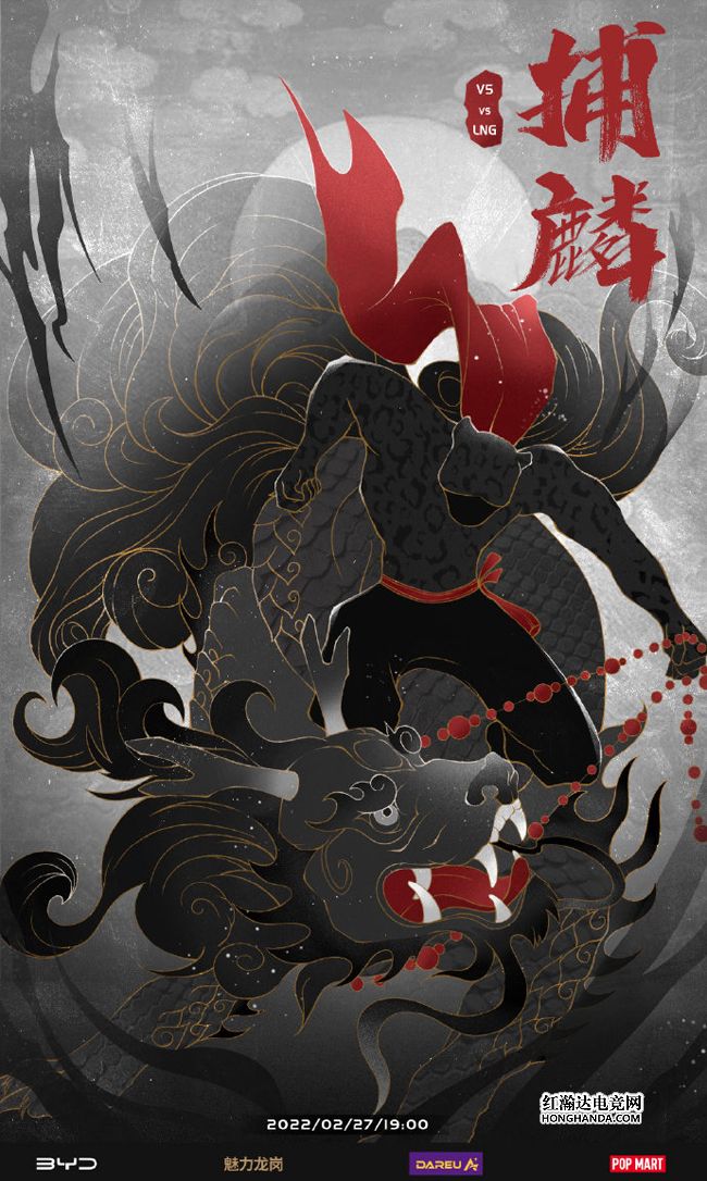 V5的海报标题为“捕麟”,代表V5的黑衣武士正在和LNG吉祥物麒麟展开搏斗,并且已经稳居上风~在本赛季再度脱胎换骨的“大威天龙”势头正猛,积分8-1仅输给WBG一场,今晚和LNG的对决看点十足:Rich、Ale上路争锋,Rookie、Doinb两位S赛冠军中单强强对话以及“莫欺少年穷”的Photic、“国产之灯”Light下路交手,加上野辅的联动博弈,一定会给第六周画上一个精彩的句号,让我们拭目以待!