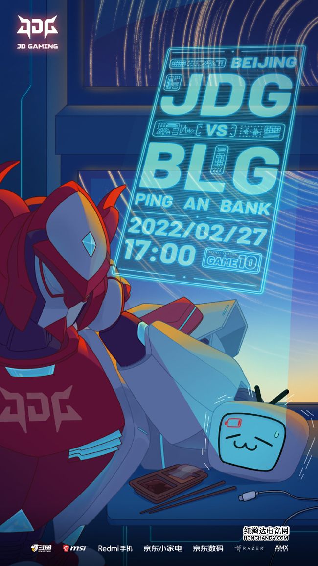JDG的海报标题为“Out of Power”,象征JDG的机甲战士在通往赛场的专列上享用了美味佳肴,却发现BLG小电视样式的充电宝电量见底,怎么撑到抵达赛场是一个大难题。积分5-4的JDG只比BLG少赢一场,所以如果本场获胜有望超越卡在两队中间的TES,慢慢升到积分榜上游梯队。