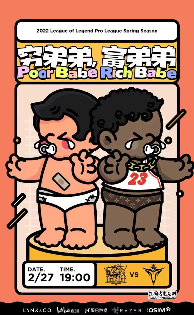 LNG的海报标题是“穷弟弟,富弟弟”,英译名中的“Poor”和“Rich”加上下方身穿23号球服的黑皮肤宝宝玩起了V5上单“风暴界乔丹”Rich的ID梗,而“穷弟弟”更是玩起了自家上单Ale“50块奶茶”的梗~LNG的7连败被终结后遭遇2连败,而今晚的获胜方将暂居第二名,不知LNG能否打破“高开低走”的魔咒?