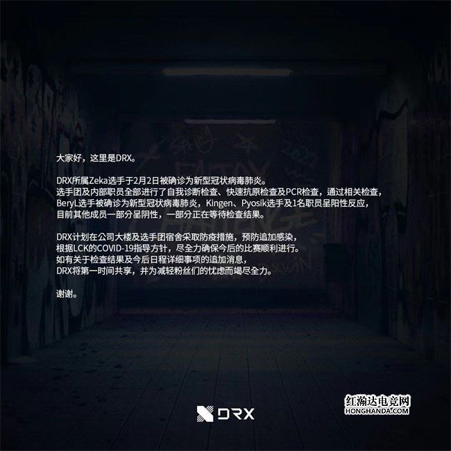 2月3日,根据韩媒INVEN报道,LCK联赛DRX战队内部发现新冠疫情,中单Zeka、辅助BeryL两位选手被确诊为新型冠状病毒肺炎,俱乐部内其他人员经过紧急筛查,上单Kingen、打野Pyosik两位选手及一位职员呈阳性反应。余下人员也在进一步检查中。目前DRX战队已经根据有关规定对公司大楼及选手宿舍等区域采取了防疫措施,并根据LCK防疫方针来保障后续比赛的进行。