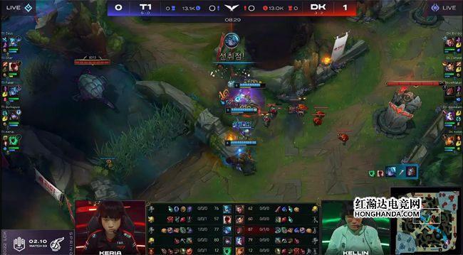 开局8分钟T1野辅双游中路得手,虽然锤石的闪现EQ被发条的闪现化解,但Oner盲僧极限距离的Q技能命中发条,第二段跟进接R闪踢回发条的同时也扭开了发条的大招,由Faker的薇古丝拿到一血,盲僧顺手控到峡谷先锋。