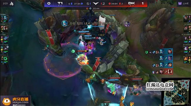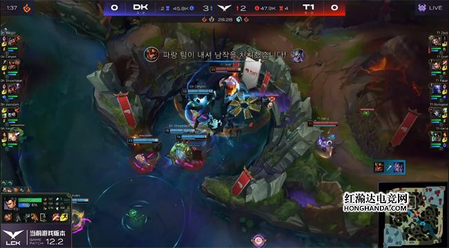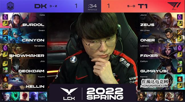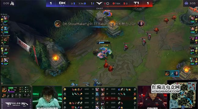 DK的大龙buff收益为上路两塔加“听牌”火龙魂,但没有拉开经济差。34分钟卡尔玛蹲在小龙河道入口草丛,先手RQ命中了岸上ShowMaker的维克托,维克托第一时间舍不得交闪现,不料连吃了杰斯的加强炮和烬的W动弹不得,杰斯闪现锤形态秒掉维克托,DK双C一波突然“暴毙”,T1试图一波时Canyon的皇子大招框后排、惩戒炮车接金身天秀守家,随后皇子还抢到了火龙魂!后期双方在远古巨龙河道拉扯时女警发现了在侧翼poke的杰斯,果断狂风骑脸完成单杀,减员的T1被各个击破,DK稳稳解锁了双龙汇,最终在55分钟打出1换5团灭T1一波结束比赛,有惊无险1-0先持得点!