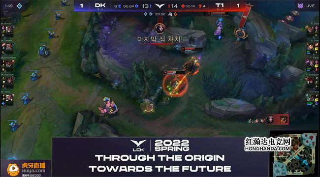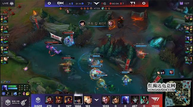 Gumayusi的女警作为T1唯一的优势点,在大龙出生前狂补242刀并做出两件套,不过换线到下路的杰斯又被刀妹单杀,DK迅速拔掉T1全部外塔。中期T1在大龙坑的视野几乎为零,DK抱团果断开大龙,Canyon拼惩戒自信地拿下大龙,DK推掉中路水晶后全员上头,T1抓住机会打出2换5团灭DK,暂时稳住了局势。28分钟T1三C在中路频频poke,压低了DK后排的血量,转身直接开大龙逼团,打出2换5团灭DK稳稳惩下大龙,追平了全部的经济差!最终T1在DK下路高地打出2换5一波结束比赛,让一追二翻盘击败DK,豪取六连胜完美收官!