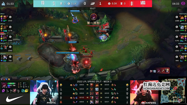 在WBG一二楼亮霞洛的情况下V5掏出了EZ加悠米的组合,对线期变得极为难受,霞洛不断压制兵线,佛耶戈顺势前来越塔,在6分钟连续击杀了两波EZ,拉开了双方下路的差距。皇子在救援下路无果以后转而将矛头对准上路,帮助酒桶击杀了纳尔。前期拿到优势的佛耶戈节奏极其紧密,连续控到小龙和先锋,随后在下路帮助霞吃到镀层的同时还再次越塔击杀了EZ,V5中野试图反打但WBG拥有人数上的优势,逐个击破带走V5四人,彻底把经济优势扩大。