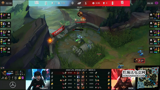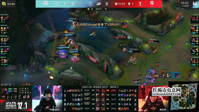 2022 LPL春季赛常规赛第三周第三日,WBG战队迎战V5战队,TheShy和Rookie两位曾经携手夺得全球总决赛冠军的亲密队友在本赛季各奔前程以后不可避免地将要首次以对手的身份在赛场上相遇。V5在先拿下第一局的情况下被扳平比分,WBG在决胜局里通过拖发育的战术撑到双C成型,最终团战压制击败了V5,拿下今天BO3的胜利。