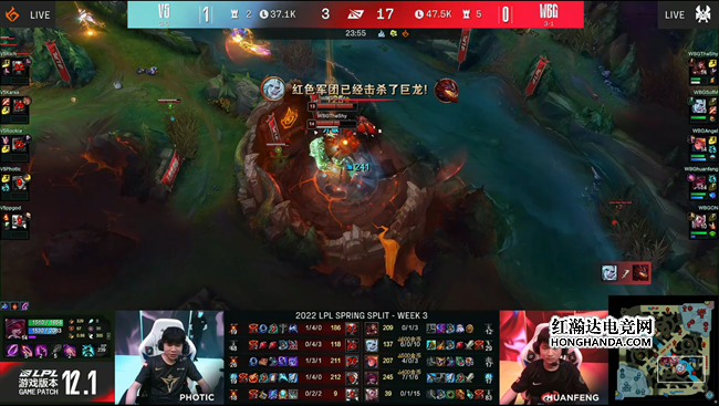 V5双龙会在手正面已经形成压制之势,他们带领兵线一步步推进高地,同时击溃了WBG所有尝试性的抵抗,一鼓作气结束了比赛,恭喜V5先下一城!