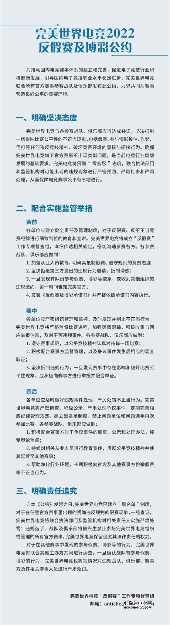 《完美世界电竞2022反假赛及博彩公约》正文: