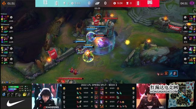 开局TES三路全都手握线权,Xiaopeng的皇子刷完自家蓝buff野区选择入侵OMG下半野区,打出波比的闪现后和瑟提双游中路,虽然发条插在野区的视野发现了TES野辅的动向,但TES中野辅直接不讲道理地越二塔强杀了交出闪现的发条,波比晚来一步,没能收掉皇子。