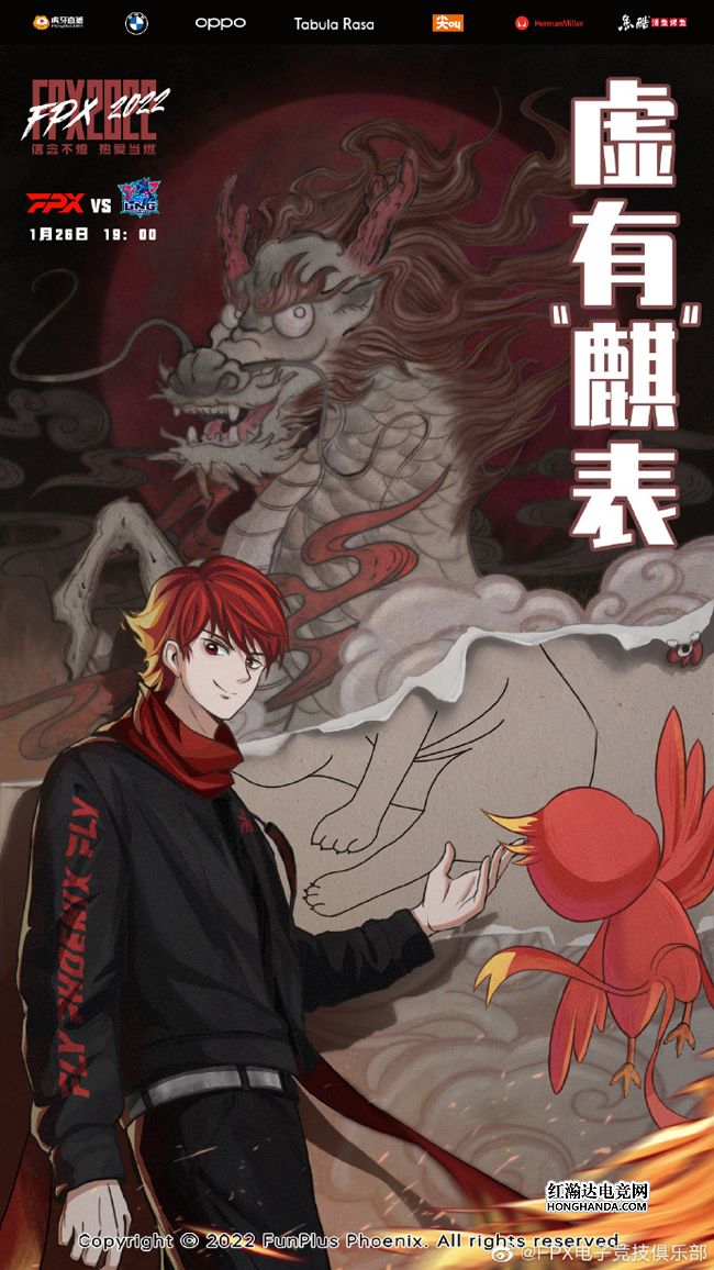 FPX的海报标题为“虚有‘麒’表”,小凤凰少年和小火鸡正在欣赏LNG吉祥物小麒麟的同款壁画,两人发现了暗藏在壁画中的玄机——壁画破损的下半部居然露出了堪比幼儿园水平的涂鸦,使得整幅壁画看上去不伦不类。FPX和LNG的较量看点十足:不但有“翔掌门”Lwx对决老队友Doinb,而且FPX的首发打野是重返LPL的Clid,他和Tarzan这两代LCK野王之间的博弈绝对值得期待,此外Doinb(金泰相)、Gori(金泰佑)、Clid(金泰敏)三人的“金泰家族内战”同样不容错过!