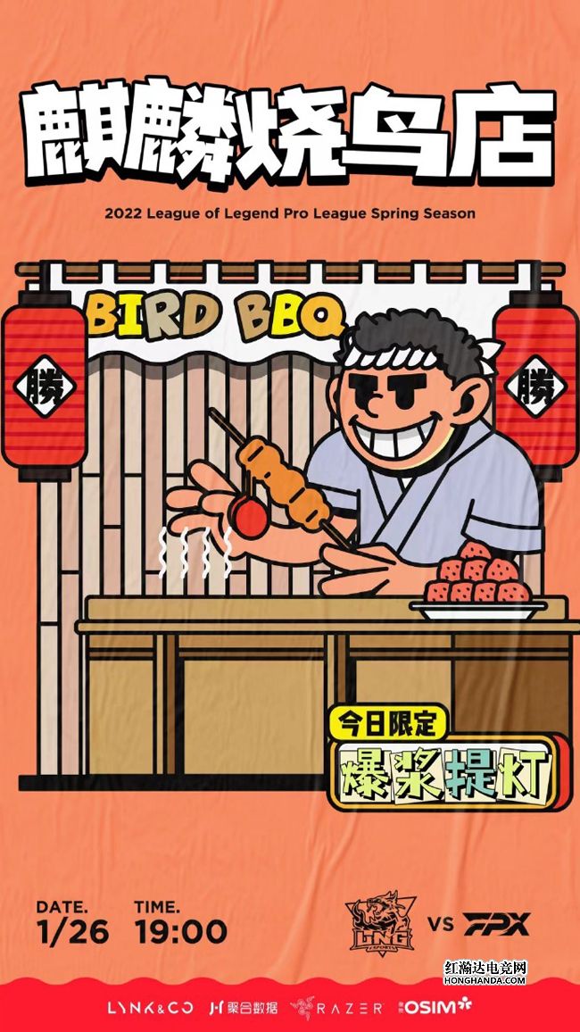LNG的海报标题是“麒麟烧鸟店”,写有“BIRD BBQ”招牌的烤肉店今天的限定菜为“爆浆提灯”,暗示下路Light会在对阵Lwx时占得上风~作为目前唯二保持着四连胜不败金身的队伍,LNG新赛季的开局可谓相当强势,考虑到同样四连胜未尝一败的EDG早已打完了年前的比赛,如果今晚LNG获胜将暂时坐上积分榜的头把交椅,就看inb哥的老东家答不答应了~