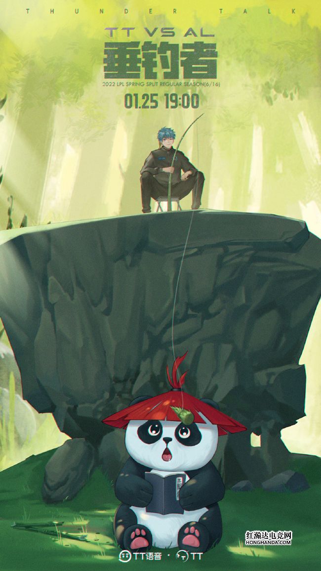 TT的海报标题是“垂钓者”,身穿TT队服的蓝发少年坐在巨石上,拿着钓竿抛出一块竹笋,精准地落在巨石下方正在看书的AL熊猫侠客面前,熊猫手中拿着的《三脚猫》暗示AL今晚根本不是TT的对手~年前的春季赛只剩最后三天,已经打了5场比赛的TT苦吞5连败惨淡垫底,不友好的赛程安排和战绩还打动了除粉丝以外的众多网友,T宝能否在年前收官战中“咸鱼翻身”呢?