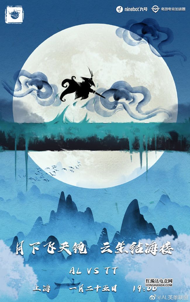 AL的海报标题为“跃”,熊猫侠客仗剑跃至半空中,背景则是一轮冉冉升起的新月,下方“诗仙”李白的名句“月下飞天镜,云生结海楼”相当应景。TT的“难兄难弟”AL自从拿到首胜后就是一波4连败,今晚究竟哪支队伍能过个好年,让我们拭目以待吧!