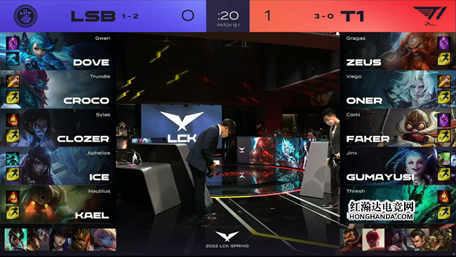2022 LCK春季赛常规赛第二周第五天,目前三战全胜的T1战队遇上了LSB战队,T1在第一局凭借上野的出色发挥轻松拿下后,第二局直接在24分钟一波团战胜利结束了比赛,2-0拿到了开赛四连胜,继续领跑联赛积分榜!