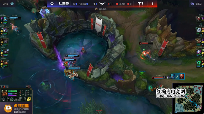 刚刚赢下先锋团的T1在防守上有所松懈出现了漏洞,LSB抓住这点机会在下路发起猛攻击杀了盲僧和女警。人马开始活跃起来,又在中路疾跑突脸直接踢死了飞机。两边在前中期打的火药味十足,T1通过对资源的掌控占有经济优势,而LSB的开团非常凶猛主动却没能获得多少东西。在第二波峡谷先锋团战再度获胜以后,T1步步紧逼把经济优势扩大到9千块左右,又找到机会抓死酒桶,逼出人马大招,随后稳稳地拿到了大龙Buff。
