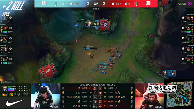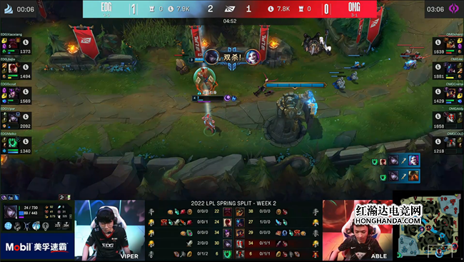 2022 LPL春季赛常规赛“电竞春晚超级周”进行到第二天,三战全胜的EDG战队面对上近日刚刚遭遇首败的OMG,在对线期就全线开花取得巨大优势,虽然OMG在第二局做出了不少调整,但整体实力还是逊于EDG。EDG战队2-0击败OMG,取得开赛四连胜!