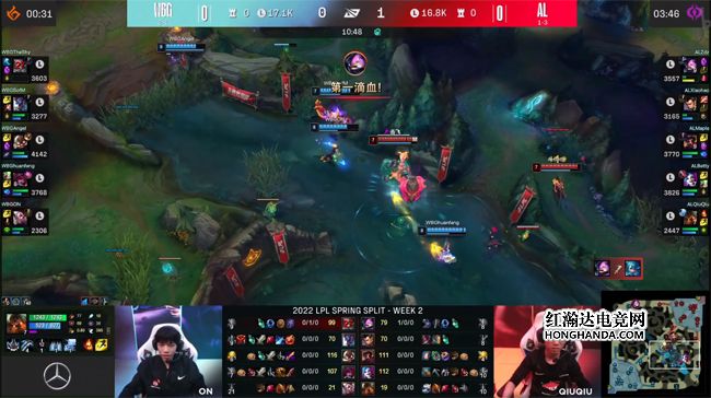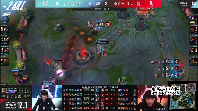 中期AL在中路主动开团,泰坦先手钩到巨魔,不过洛的魅惑令凯南第一时间无法进场,WBG先处理了泰坦再追击,凯南大招进场和后排脱节,WBG得以打出1换2,稳稳地将大龙收入囊中!23分钟WBG推进中路高地,洛开大进场吸收了AL的第一波技能无憾倒地,格温侧翼突破牵制了AL四人,Angel的飞机携带炸药包直取后排怒砍三杀,WBG突然提速打出2换4一波结束比赛,1-0先下一城!
