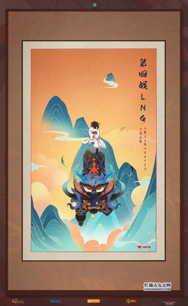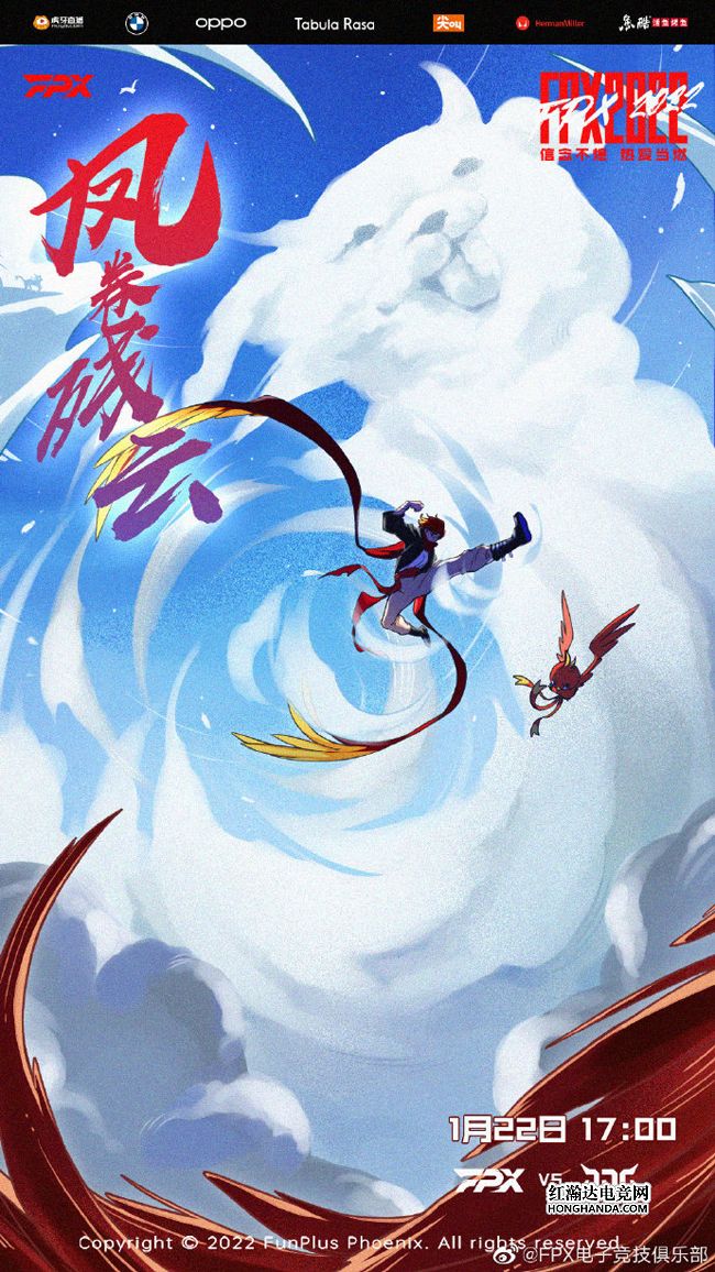 FPX的海报标题为“凤卷残云”,小凤凰少年和“满级宠物”小火鸡正在半空中大展拳脚,即将冲破JDG吉祥物Joy化作云朵之后摆下的迷阵。FPX同LNG一样打出了一波三连胜状态火热,表现亮眼的上单xiaolaohu将在上路对阵“拉扯哥”369,不知谁能带领队伍笑到最后。