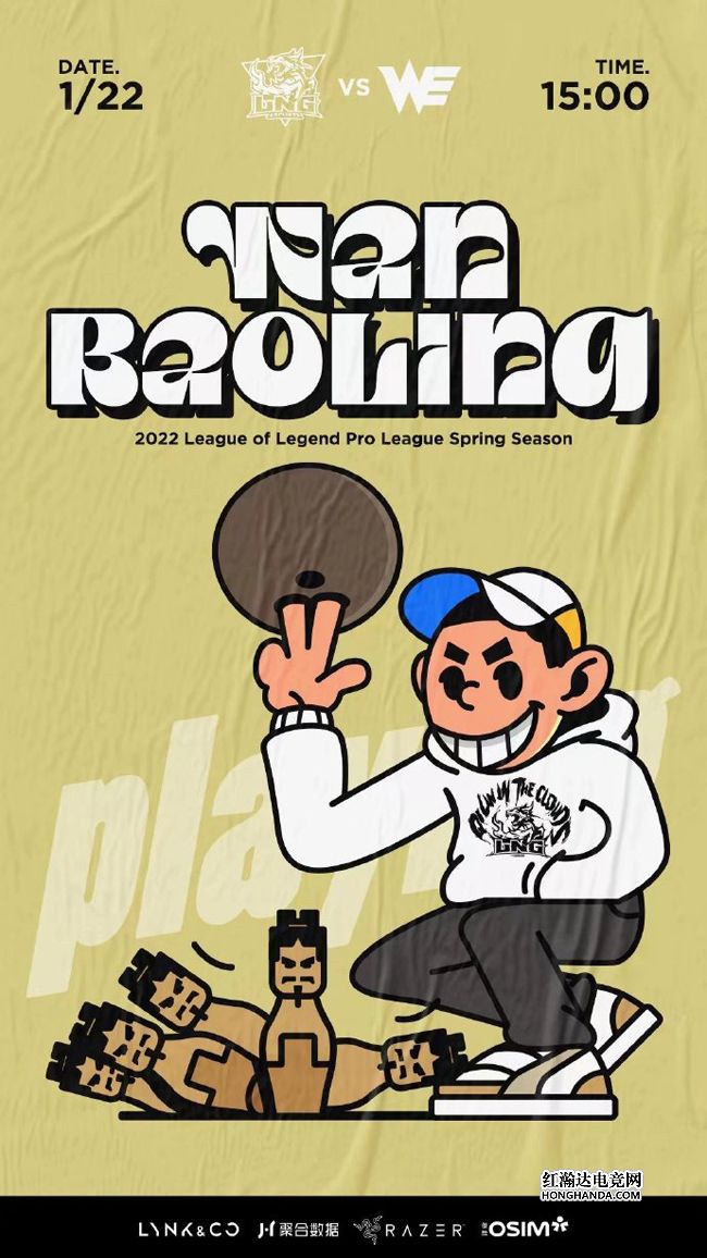 LNG的海报标题为“Wan BaoLing”,身穿LNG新款白色队服的队员手指上插着保龄球,地上像不倒翁一样的保龄球瓶正是对手WE主场西安标志性的兵俑造型。3连胜的LNG今天打头阵,而WE近期遭遇三连败状态不佳,LNG有望成为LPL第一支解锁四连胜的队伍!