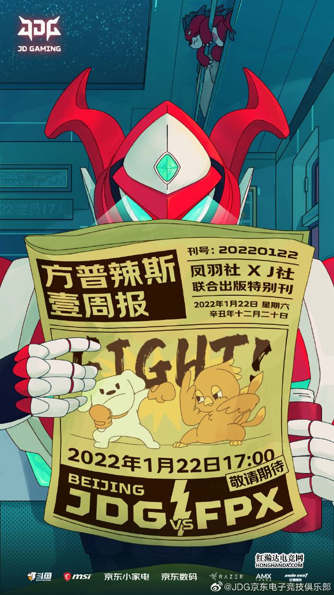 JDG的海报标题是“京准打击”,象征JDG的机甲战士坐在通往赛程的列车上,利用眼部扫描器分析了本场对手FPX为比赛刊出的报纸,试图找到一些有用的信息,机甲战士头顶的行李架上是“战利品”——LGD吉祥物小红龙。开赛2连败的JDG终于在上一场对阵LGD时以2-0拿下春季赛首胜,因此今天的首发AD仍然是打LGD时发挥出色的Hope,期待“希望老师”和“翔掌门”Lwx的精彩对决!