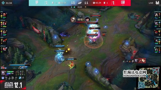 中期UP掩护第二只先锋通关了中路,不过付出了中野两人的代价。LGD在中路开了两波好团,shad0w的皎月绕后ER打出女警的秒表,青钢影再次拿到终结人头,UP唯一的优势只有“听牌”了海克斯龙魂。30分钟青钢影在中路大招先手但和队友脱节,拉克丝依靠秒表拖到了支援到场,UP反杀青钢影和皎月,顺势拿到大龙和龙魂的双龙汇!UP回城补满状态平推下路高地,打出1换5团灭LGD一波结束比赛,终于解锁了春季赛首胜!
