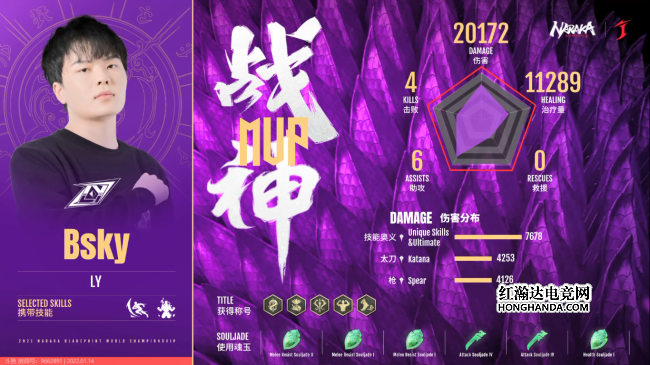 本局战神给到LY丶Bsky。他操刀岳山打出20172伤害量以及4次击败,凭借身法战到最后帮助队伍斩获荣光,战神称号实至名归。