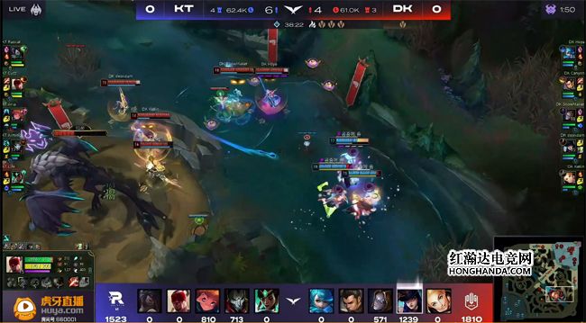 开局DK下路组延续了上一场的压制力,抢到2级后卡尔玛两发RQ把KT两人打成残血,皇子趁势入侵KT的下半野区,导致KT双人组不敢留在塔下吃经验,薇古丝被迫传送下路,KT在中野支援的情况下四打三只打出1换2,烬收了皇子的人头,不过KT野辅双双阵亡。