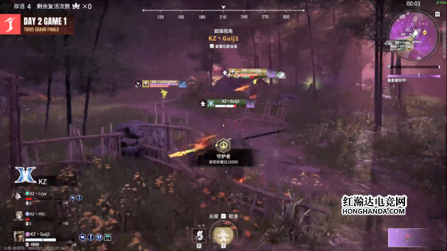短暂和谐过后BAODA丶YJJPP天降宁红夜打破宁静,一时间大佛四起,人数骤减。决赛圈KN丶ZiYu大佛双爪清场,机智的KZ丶Guiji面对满编的KZ早早远离战场,利用岳山变身机制将比赛拖成平局,KZ跟KN并列第二。