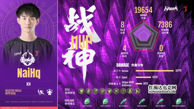 本局战神给到了KN丶NaiHq,他打出19654伤害量以及8次击败,帮助KN战队拿到31.8高额分数。