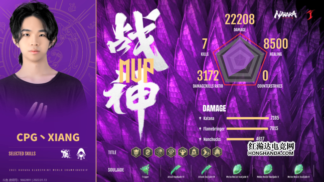 本局战神自然给到了CPG丶XIANG。他这局打出2万2的高额伤害以及7次击败,拿到了恐怖的15.2分,为后面的比赛打下良好基础。