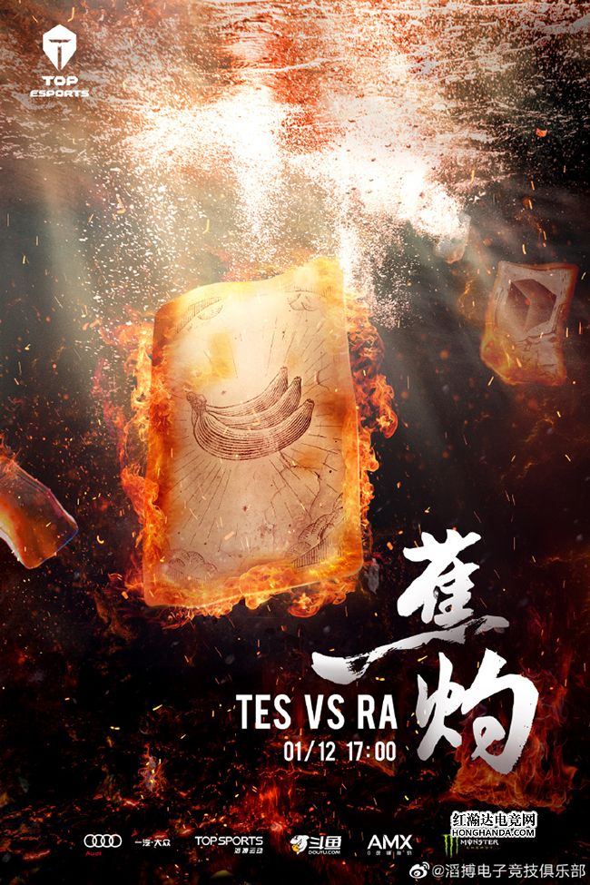 TES的海报标题是“蕉灼”,沉入水中的秘籍上印有“香蕉”的图案,这和标题后配的表情包香蕉、火苗一同暗示着RA队长iBoy和RA会在这场比赛中陷入TES如烈焰般的攻势之中无力回天~TES在转会期组建出了万众瞩目的“天选全华班”——Zoom、Tian、Xiaopeng三人加盟,极大地补强了上、野两个位置,再加上磨合已久的双C“水手组合”,这支TES实属未来可期!