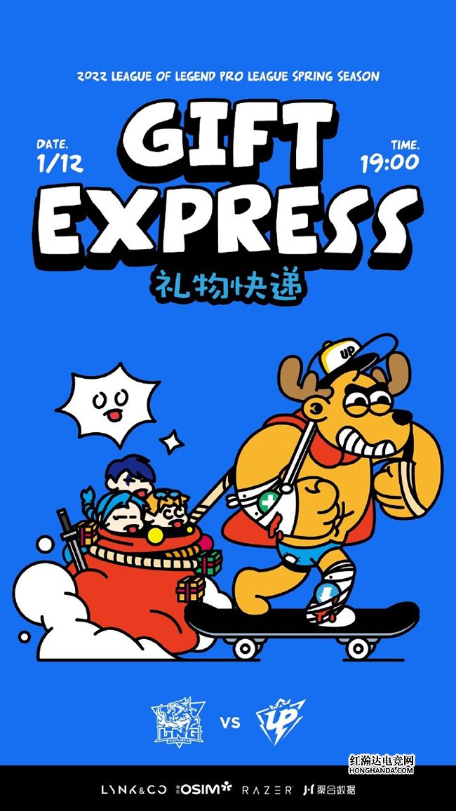 LNG的海报标题是“礼物快递”。头戴印有“UP”帽子的麋鹿踩着滑板正在运送给对手LNG的新赛季见面礼,麋鹿和礼物福袋中的金克丝、EZ、厄斐琉斯都暗示UP新赛季的AD选手Elk,看来LNG或许要针对UP的下路了。参加了去年S11世界赛的LPL四号种子LNG在转会期的人员变动不大,Doinb接替了离队的icon,同时签下JDG的辅助LvMao,本场两人都作为首发登场,不知“自带体系”的Doinb会与小麒麟LNG产生怎样的化学反应呢,让我们拭目以待吧!