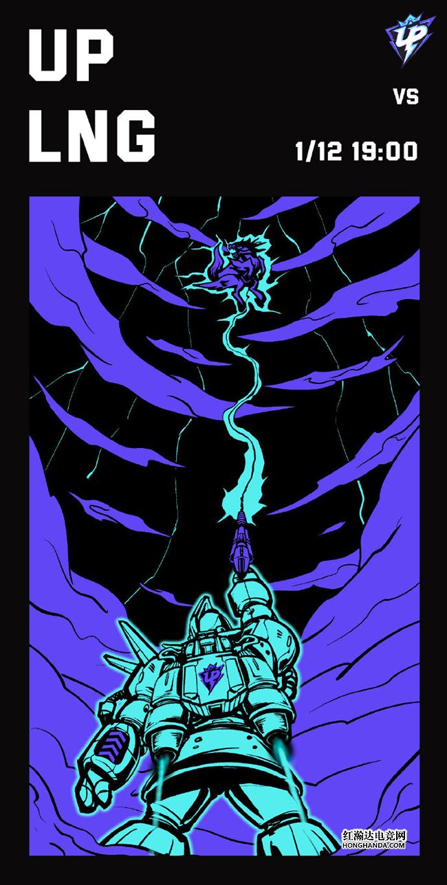 UP的海报标题为“云中狩猎”,和LNG的战队slogan“麒麟云中现”隔空联动起来,不过是一波“反向联动”:印有UP队标LOGO的机甲战士手持雷电枪,精准集中了潜藏在云中的麒麟。UP在转会期引入RNG“岛一中”Cryin和WE战队的Elk替代去年夏季赛的xiaocaobao、Smlz,就德杯表现来看全新UP的潜力十足,有望成为今年春季赛中的一匹黑马!