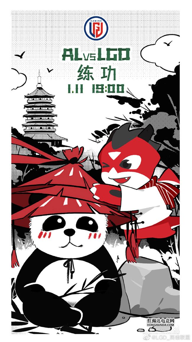 LGD的海报标题为“练功”。对手AL的吉祥物大熊猫初来杭州,正在雷峰塔附近练功休整,不料调皮的LGD吉祥物小火龙想要给大熊猫一个“见面礼”,尝试把熊猫戴着的斗笠顺走~LGD在转会期的人员变动较大:中、下三人全部离队,转型为辅助的老将Jinjiao和前OMG战队的AD选手Eric加入,希望Jinjiao可以帮助“乐观家族”在春季赛打出好成绩。