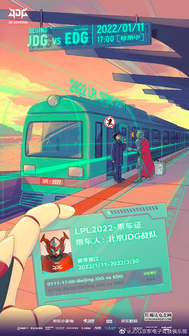 JDG的海报标题为“启行”。海报采用了JDG机甲战士的第一视角,战士手持“LPL2022乘车证”,准备搭上通往新赛季的列车,远处代表EDG的重甲骑士被乘务员拦在了登车口,由于骑士的行李箱中有长剑,这样的“管制刀具”很明显无法带上列车,看来EDG似乎遇到了不小的麻烦~JDG在转会期保留了主力中野和AD,以“公爵”Zoom交易到更为年轻的369,辅助则是WE战队的Missing,不知JDG这套阵容会在自己的春季赛首秀带来怎样的表现?