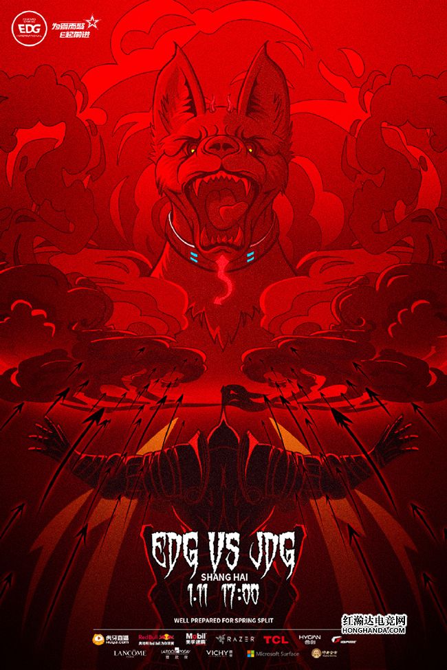 EDG的海报标题是“巅峰后,又启新征程!”EDG骑士的新赛季首战的对手即是“恶魔犬”JDG,骑士背后的箭雨火力及时支援到场,或许会让JDG吃到不小的苦头。S11全球总决赛新科冠军EDG在新赛季继续保持着全主力阵容,期待他们在春季赛的发挥!