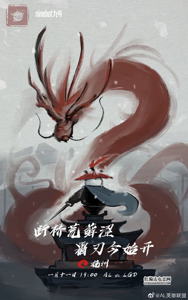 AL的海报标题为“出鞘”。熊猫侠客立于江面上的小舟顶部,一手持剑的背影威风凛凛,天空中盘旋着的正是代表LGD的红色巨龙,下方的两句诗“断桥荒藓涩,霜刃今始开”化用了唐朝诗人张祜的《题杭州孤山寺》——“断桥荒藓涩,空院落花深”,改了半句后的意境十分契合海报标题,暗示这场激战必然万分精彩!RW在转会期被AHQ和AG超玩会合资收购,更名为AL(Anyone's Legend),LOGO是“国宝”大熊猫,引援方面只补强了中路:签下PCS赛区的老熟人Maple,不过今晚的首发中单还是去年夏季赛的主力“蕉太狼”Forge,究竟哪支队伍能够解锁首胜呢,让我们拭目以待吧!