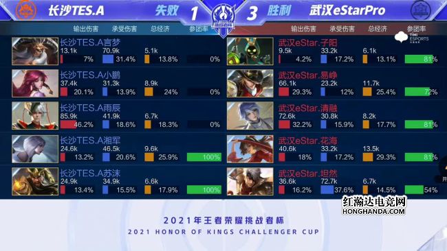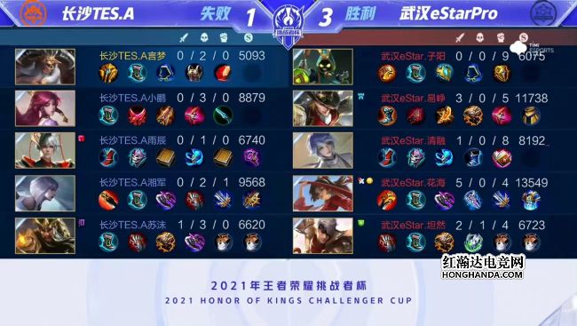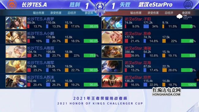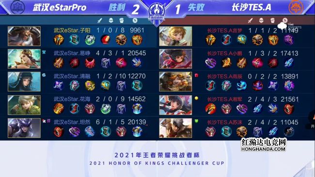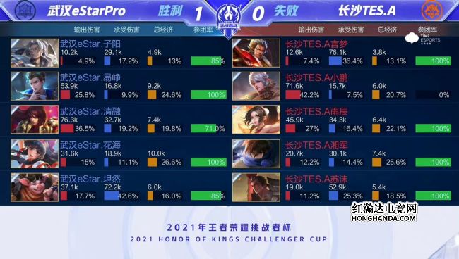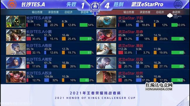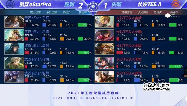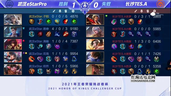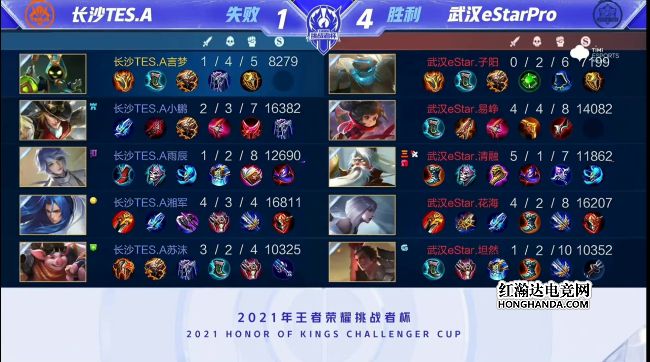 2021年王者荣耀挑战者杯首场半决赛由武汉eStarPro对阵长沙TES.A,武汉eStarPro是今年秋季赛的冠军,长沙TES.A首次晋级大型赛事四强。最终,武汉eStarPro四比一战胜长沙TES.A,武汉eStarPro晋级挑战者杯总决赛。