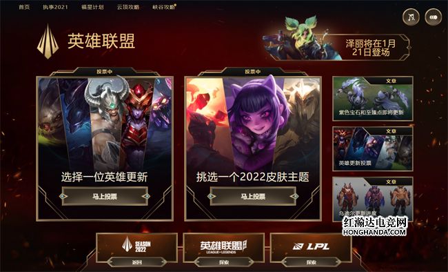 2022年“英雄选择”视觉玩法更新投票又回来了,今年的五位候选英雄分别是:龙女、梦魇、蝎子、蛮王、大嘴,召唤师们可以在1月17日中午12:00前于《英雄联盟》客户端内直接投票。