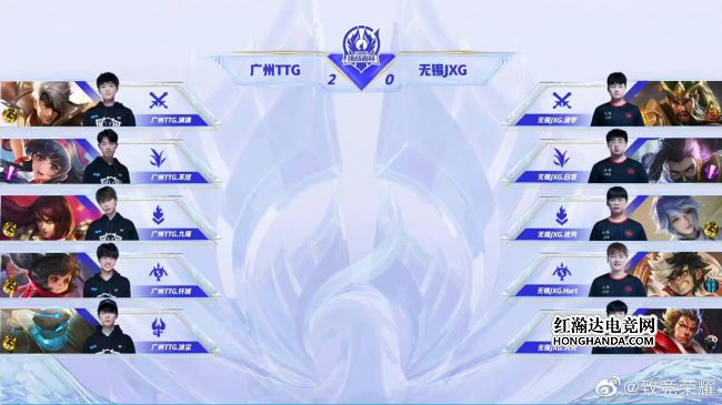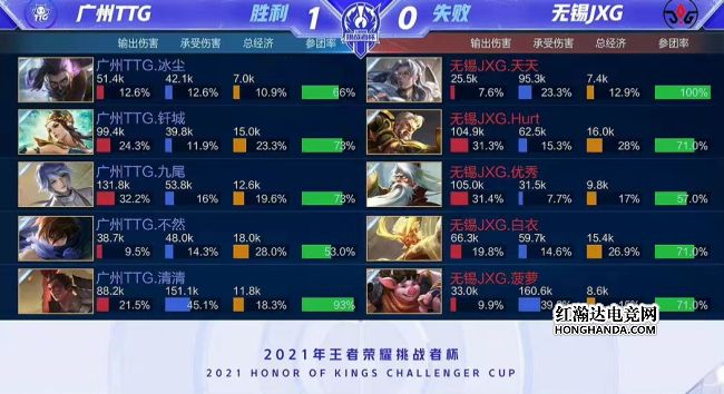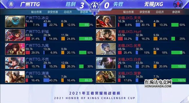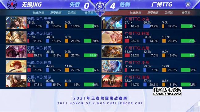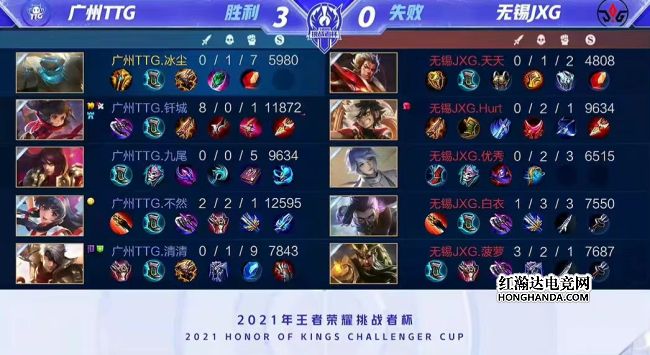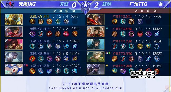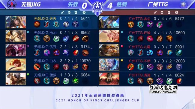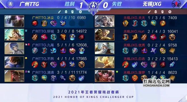 2021年王者荣耀挑战者杯最后一场四分之一决赛由广州TTG对阵无锡JXG,一支是KPL赛区秋季赛亚军,一支是KGL赛区秋季赛冠军。最终,广州TTG四比零轻松击败无锡JXG,广州TTG晋级四强,他们下一轮的对手是佛山GK。