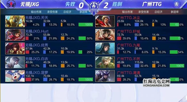 12分钟,东皇太一咬中夏侯惇,夏侯惇被集火倒地,12分半,铠拿下暗影主宰,12分45秒,裴擒虎点大乔大招传送被阻断,裴擒虎倒地,13分钟,东皇太一闪现咬中干将莫邪,公孙离收下人头,铠拆掉JXG上路高地,14分钟,东皇太一咬死老夫子,铠一刀砍死夏侯惇,JXG双前排倒地,14分半,JXG再掉中路高地,蒙恬开大逼位置,东皇太一将裴擒虎在泉水前咬中,公孙离被干将莫邪点至残血无法清线,TTG推掉敌方水晶,战胜JXG。本局最佳给到广州TTG.冰尘的东皇太一