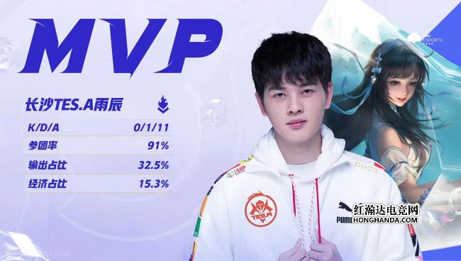 11分钟,娜可露露拿下暗影主宰,11分40秒,西施再度拉中王昭君,苏沫关羽一刀将其带走,12分45秒,狄仁杰拿下暗影暴君,14分半,王昭君开辉月未坐上电梯被秒,15分15秒,娜可露露拿下暗影主宰,15分半,关羽大招将两人推出电梯圈,关羽再接一推顶三人拿到双杀,娜可露露绕后扑三人,HI三人直接被伤害灌死,HI被团灭,TES带穿下路退掉敌方水晶,战胜HI。本局最佳给到长沙TES.A.雨辰的西施