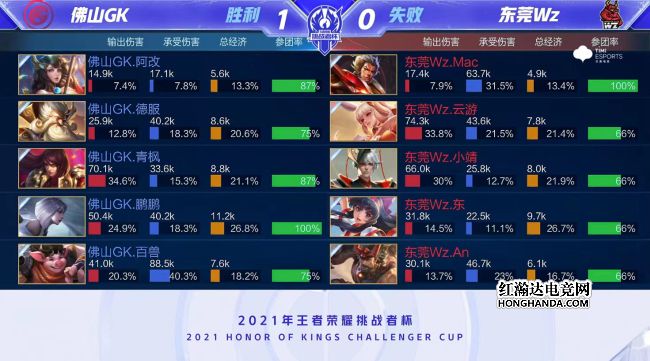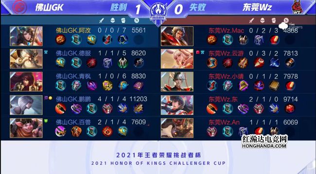 2021年王者荣耀挑战者杯选拔赛第三个比赛日第四场比赛由佛山GK对阵东莞Wz,赛制为BO1。最终,佛山GK战胜东莞Wz,升至积分榜第一。